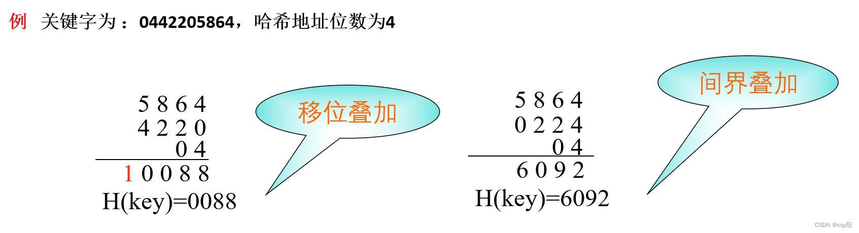 将关键字自左到右分成位数相等的几部分,最后一部分位数可以短些,然后将这几部分叠加求和。