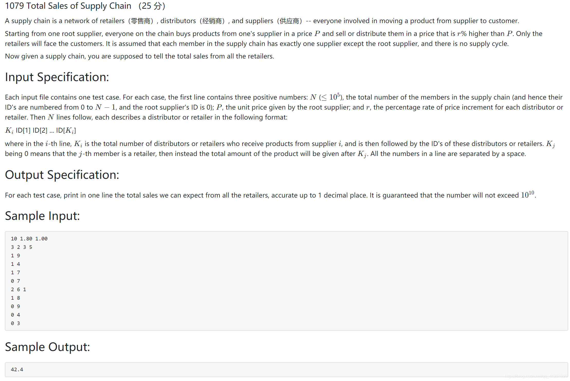 每个输入文件包含一个测试用例。在每个测试用例中,第一行包含3个正整数:N(<= 10 ^ 5),供应链中的总节点数(节点编号为0 ~ N - 1,根结点编号为0);P,代表商品的单位价格;以及r,代表每个经销商或零售商的价格增量百分比。接下来的N行,每行以下述形式描述一个经销商或零售商: