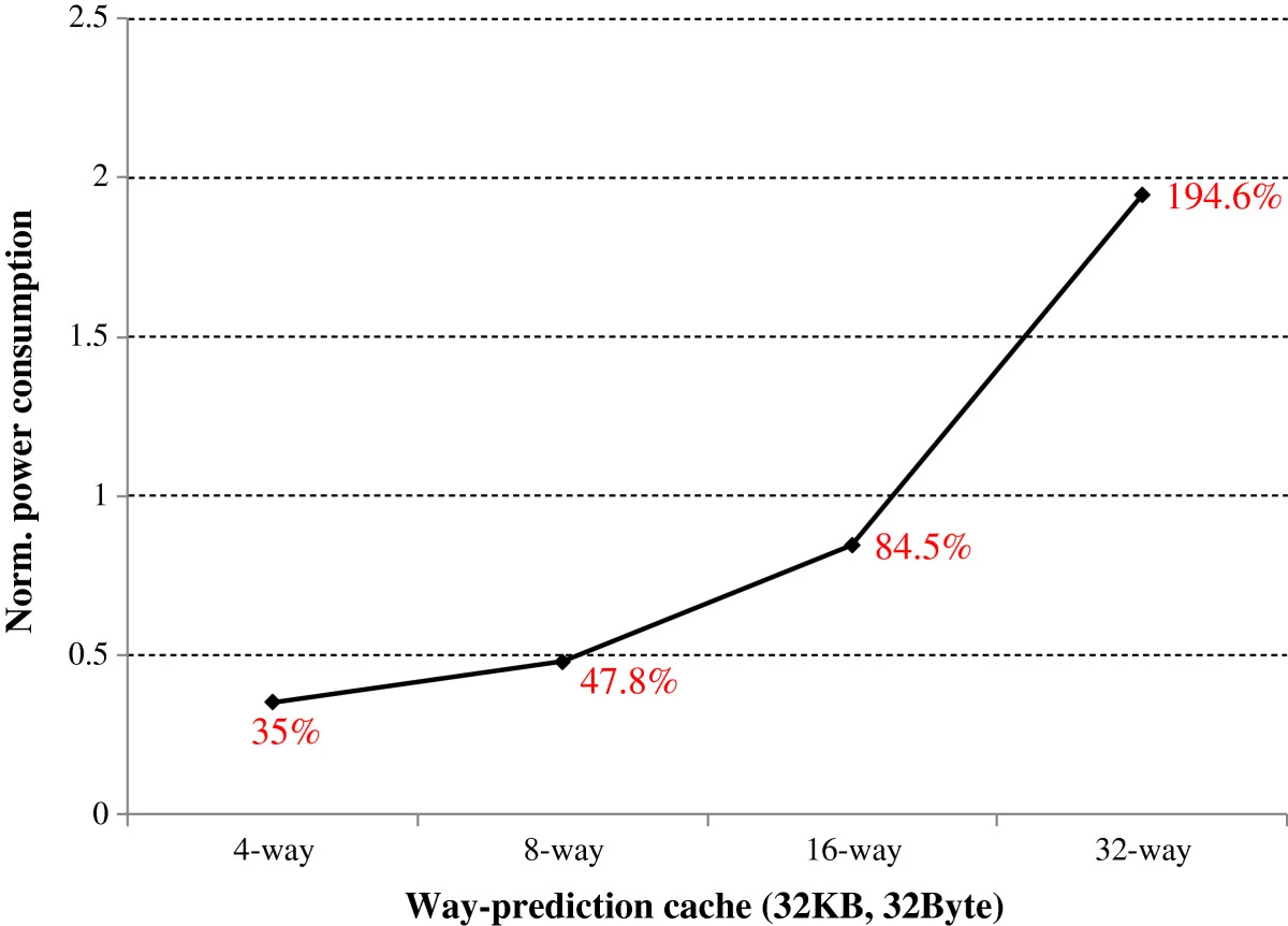 模拟表明,对于一个两路组相联缓存,路预测的准确率超过90%;对于一个四路组相联缓存,路预测的准确率超过80%。