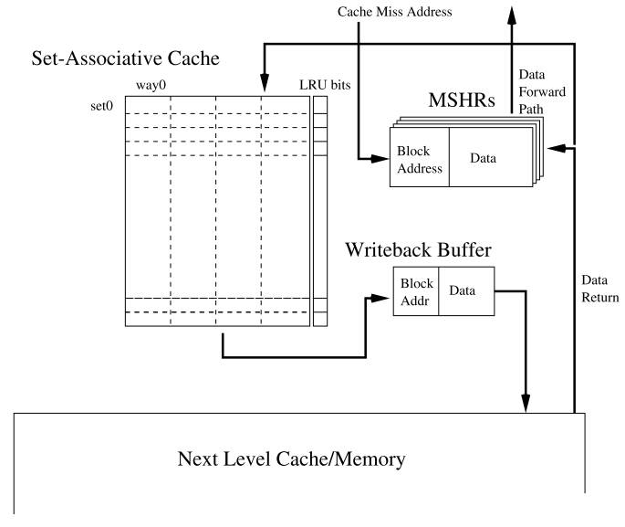 为了支持上述功能,高速缓存引入缓存缺失状态保持寄存器(Miss Status Handling Register, MSHR)硬件,内容包括:缺失块映射到缓存中的位置、缺失状态的一些控制位,以及导致缺失指令的信息。