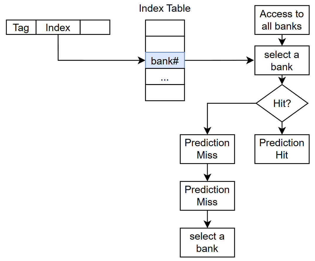 路预测技术中通过在缓存中另外保存一些控制位,用于预测下一次可能访问的路。预测控制位的目的是尽早设定多路选择器,降低传统组相联缓存中缓存标签访问+标签比较+多路选择器路由合适数据的串行时间。