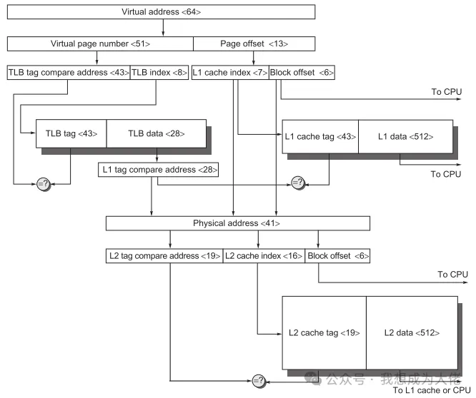 与此同时,虚拟地址页编号索引TLB和虚拟地址页偏移索引高速缓存的过程可以并行执行降低命中时间,TLB索引出的物理地址再与高速缓存索引出的标签进行比较判断命中或缺失。