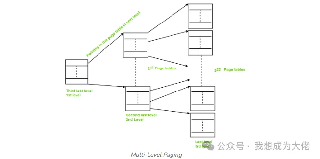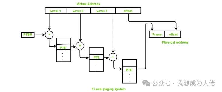 此时仅需Level1页表需要常驻在内存中;只有在访问特定虚拟地址时,操作系统才会为对应的Level2和Level3页表分配内存。