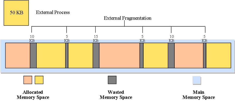 外部碎片指内存中分散的、不连续的小块空闲空间,这些空间总和足够容纳新进程,但因地址不连续而无法被分配。