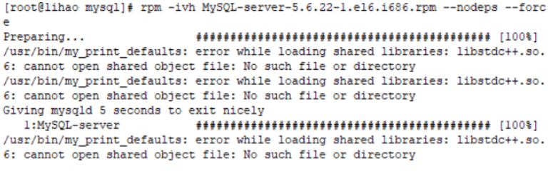 2.然后重装MySql(rpm -ivh MySQL-server-5.6.22-1.el6.i686.rpm --nodeps --force)时,如果出现/usr/bin/my_print_defaults: error while loading shared libraries: libstdc++.so.6: cannot open shared object file: No such file or directory问题。