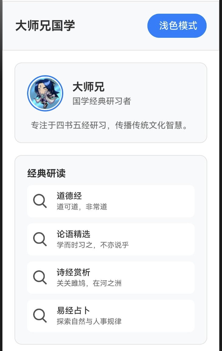 如下图所示:打开**“大师兄国学”**应用,顶部的按钮一按,整个界面——从背景、文字到卡片——瞬间完成颜色转换。这种流畅的“昼夜交替”,便是我们追求的深浅主题一键切换的境界。