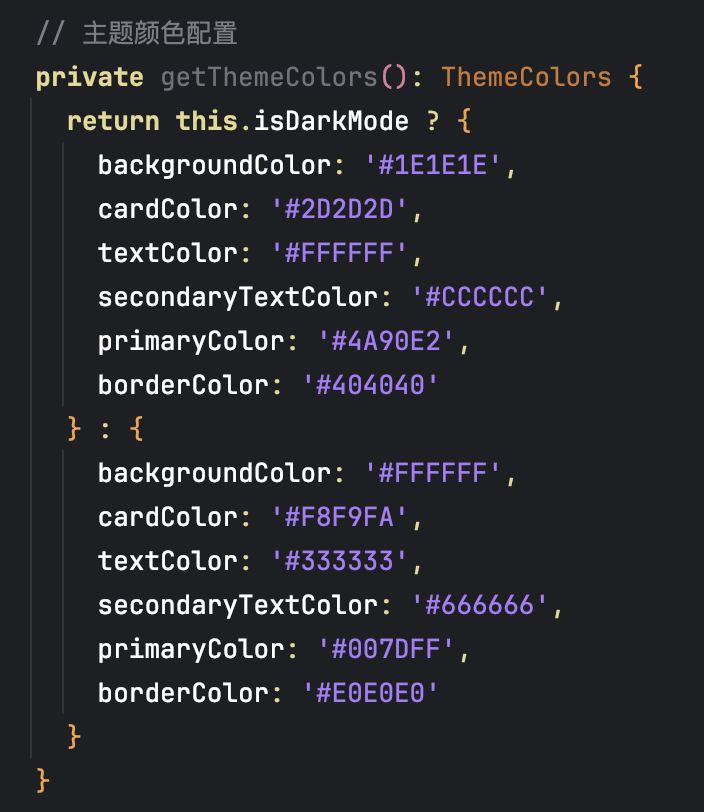 ? :(三元运算符)逻辑。虽然这个方法没有直接在build中调用,但这个逻辑是所有 UI 颜色判断的**“思想源头”**。它清晰定义了深色和浅色主题下的所有颜色值。