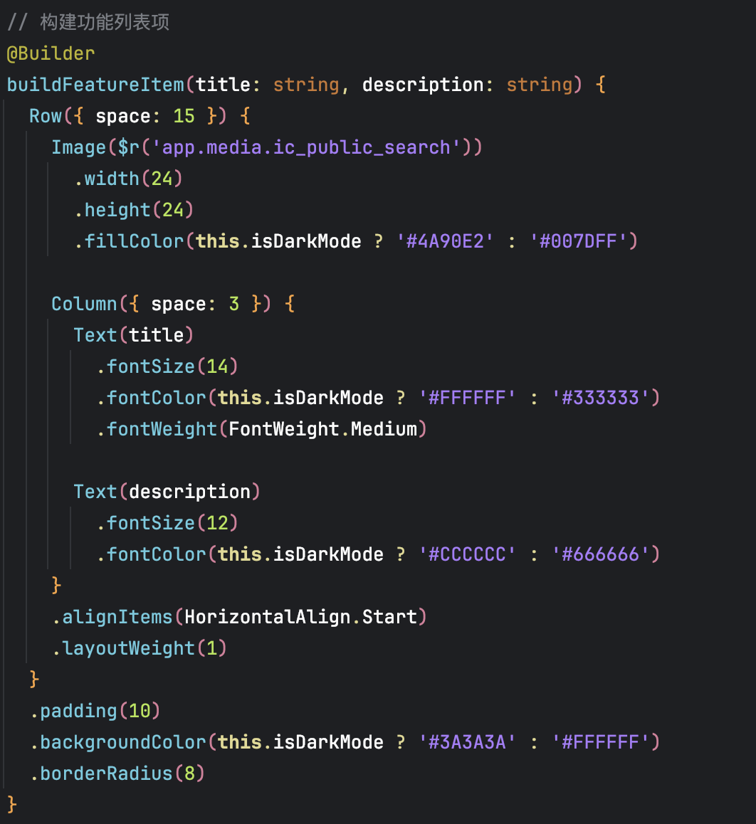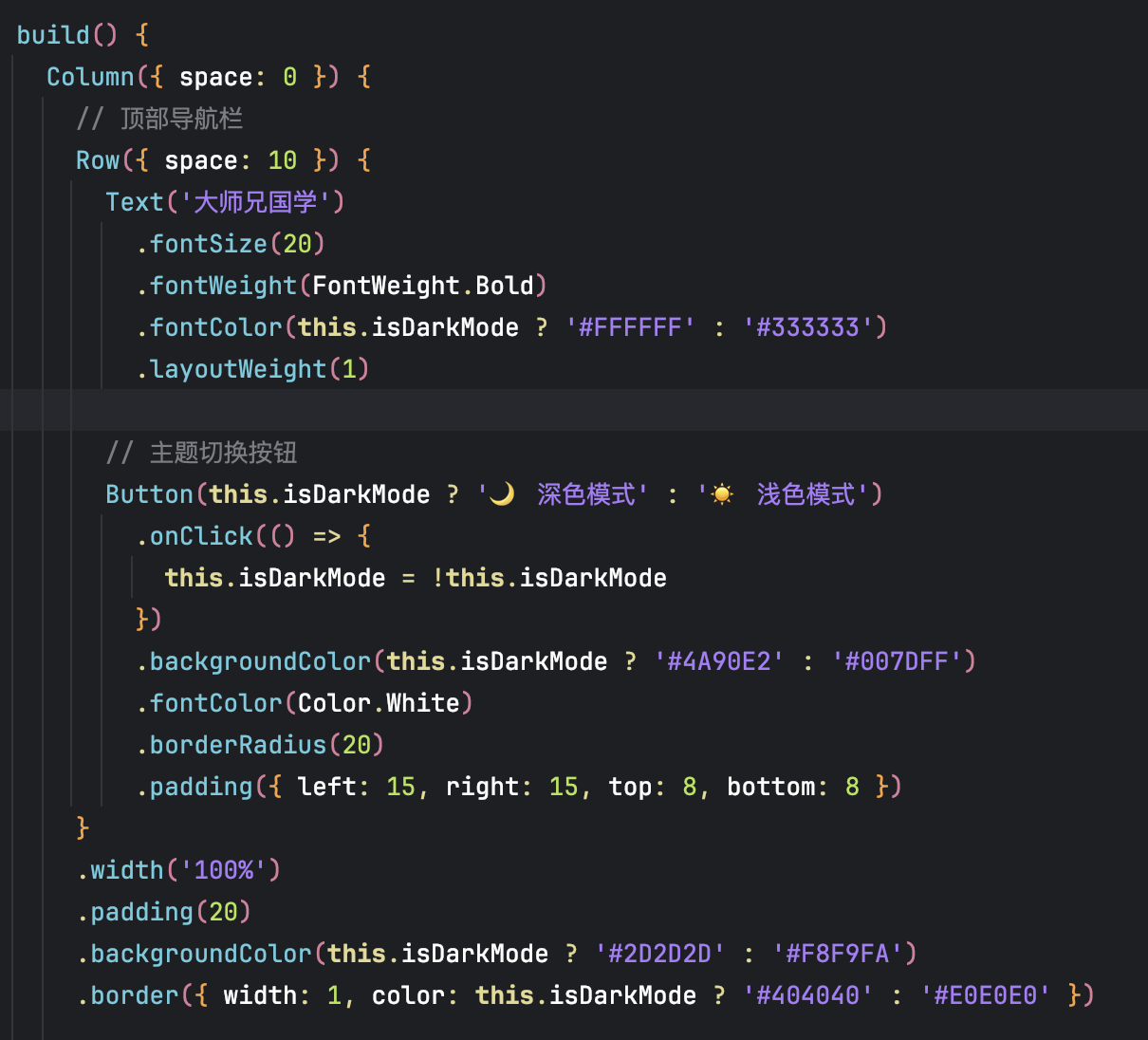 Text的fontColor、Button的backgroundColor以及Row的backgroundColor中,都使用了this.isDarkMode ? '深色值' : '浅色值'这一核心公式。- 核心交互:按钮的