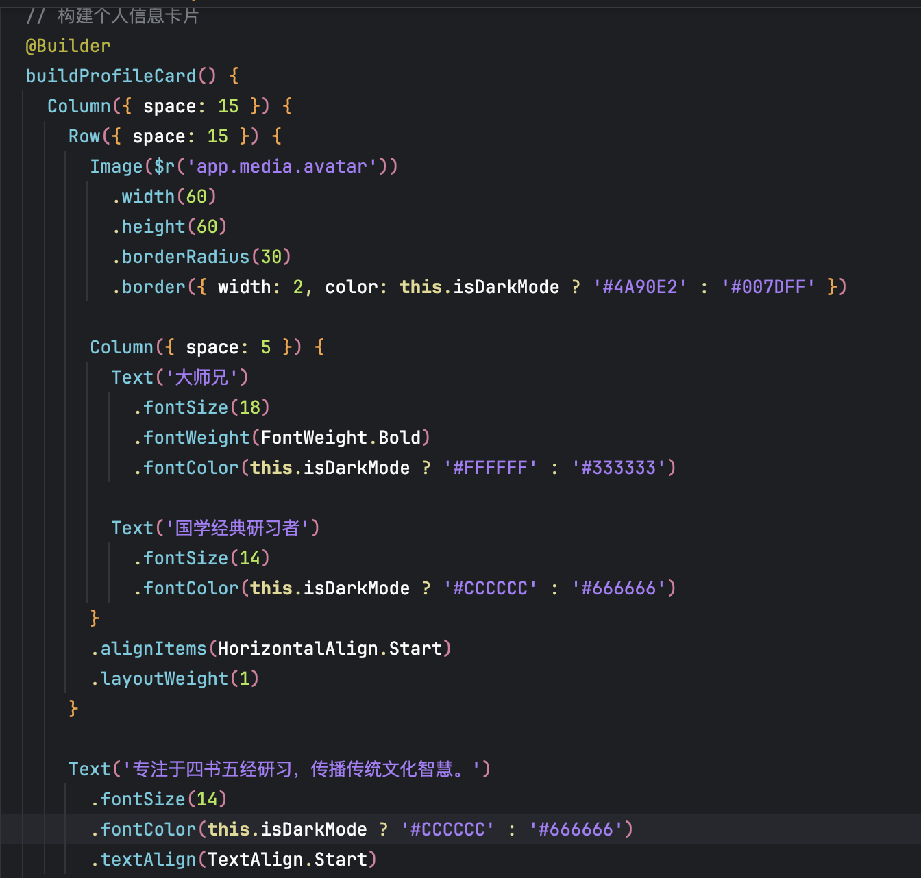 【大师兄解读】:“组件归一,变化万千”。卡片作为一个独立的 UI 单元,它内部的所有元素(文字、边框、背景、阴影)都再次使用了三元运算符,确保了无论外部主组件状态如何,它都能正确地渲染出对应的深浅主题。