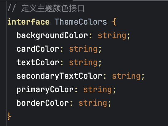 代码如同治学,先要**“定规矩”**。我们用 interface 来明确主题颜色必须包含哪些要素。