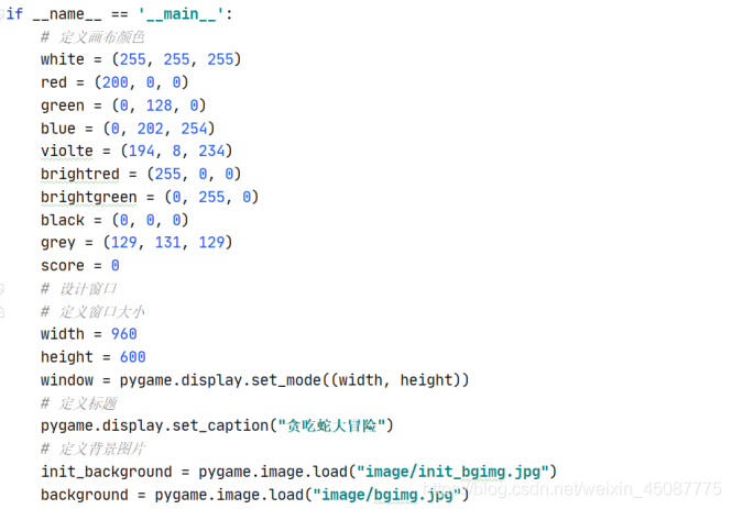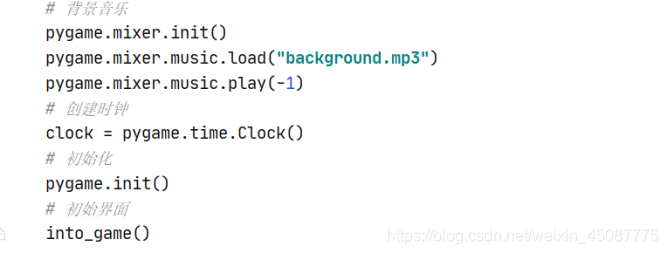 在运行模块,进行pygame库的初始化、设置游戏背景音乐、显示窗口各个参数的设置以及游戏初始界面的显示设置,具体结果代码如下图:
