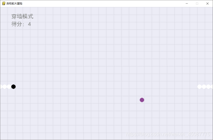 (4)在可穿墙模式中,贪吃蛇可以穿过墙面,但咬到自身后,游戏失败。