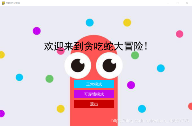 游戏初始界面实现函数,在该函数中进行游戏初始界面窗体的初始化。在该界面窗体中设置文本为“正常模式”、“可穿墙模式”和“退出”的三个点击按钮,通过设置循环,调用button函数(详细见6.2.8)监听玩家的点击。