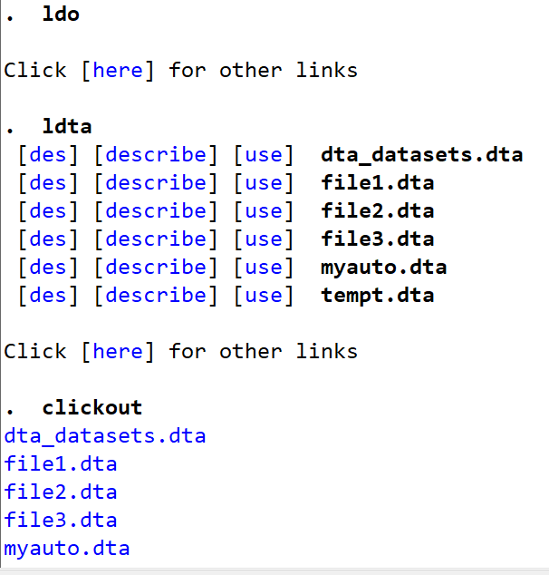 工具包 dirtools包含简化浏览文件的工具,lall命令是其中的一种,包括ldo、ldta、lsmcl、lgph等,它能相应地列示当前工作路径下的 do、 dta、 smcl、 gph等类型文件。