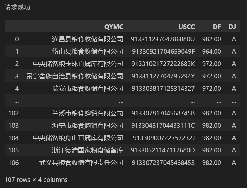 使用函数requests.get()和requests.post()这两种请求方式得到的结果相同,该数据包含企业名称、统一社会信用代码、得分和等级四个字段,共107条数据,如下: