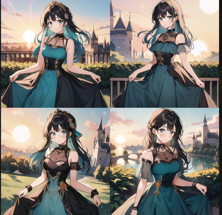 下面是我们生成出来的一组图。可以看到主角的裙子基本是锁定的,这个就是Lora的功劳。