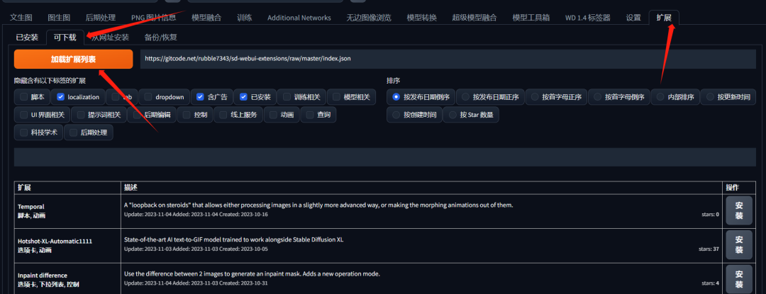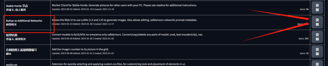 在下面的列表里找到Kohya-ss Additional Networks 点击后面安装即可。