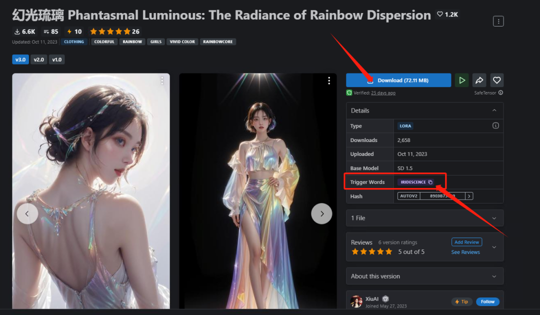 在下载页面我们还可以看到Trigger Words这一项,这个是Lora的触发词,也要记下来。
