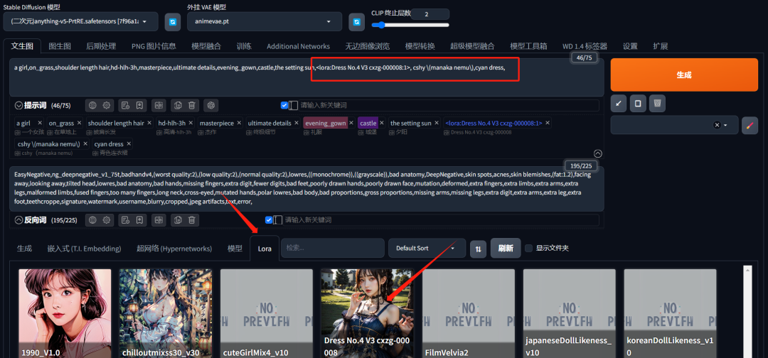cshy \(manaka nemu\),cyan dress,是这个Lora的触发词。有些模型需要搭配触发词才可以使用。