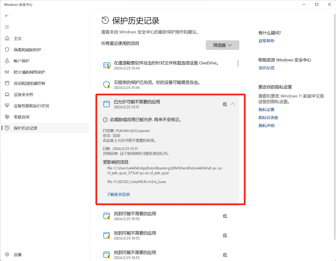如果 SD_install4CN v1.0.4_2 启动失败,以长青这边win11为例子,在安全中心-保护记录,把这个程序允许运行即可。