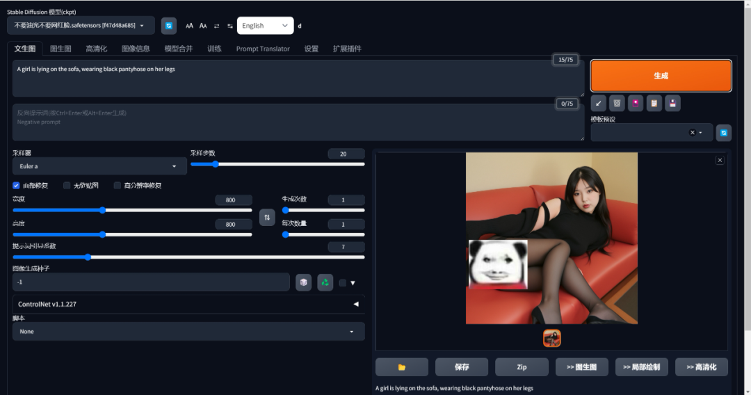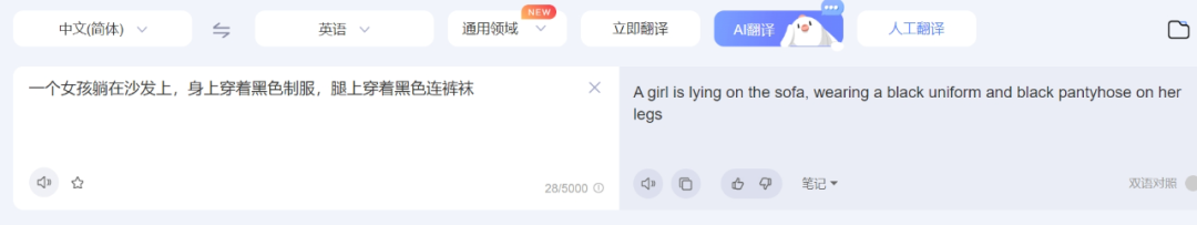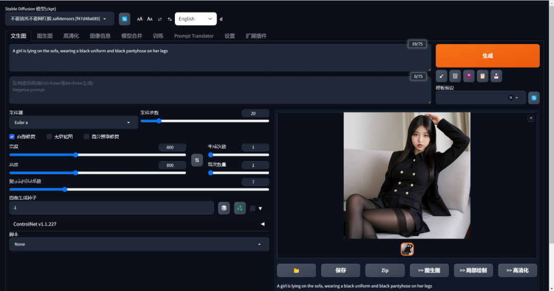 这些英文词我们可以借助翻译工具去生成,比如长青这里生成了一个穿着黑丝的女生,嘿嘿~