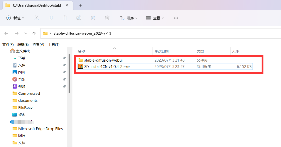 首先我们将stable-diffusion-webui压缩包和SD_install4CN程序下载到本地,按如图所示解压并放在同一目录下。