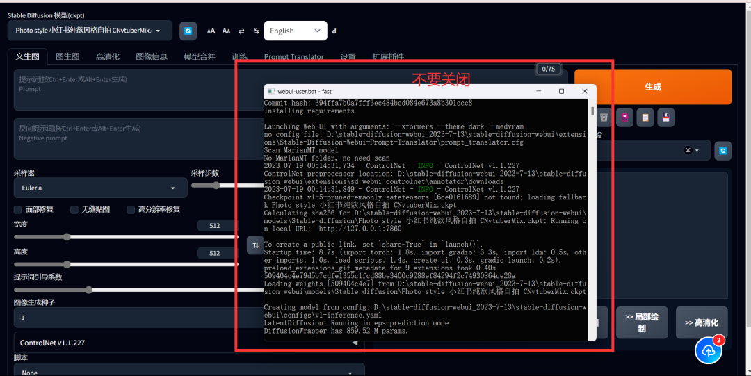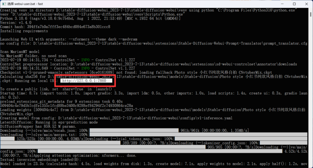 正常启动没问题的话,这边就会弹出一个窗口,程序会输出一个类似 http://127.0.0.1:7860/ 的地址。