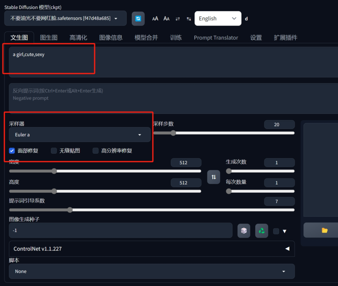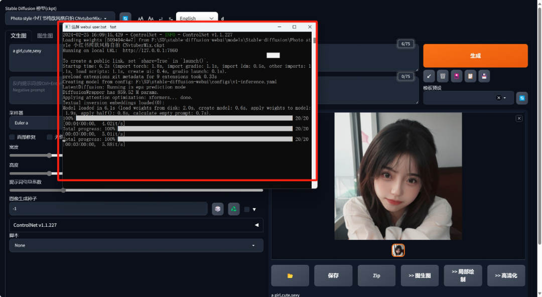 然后呢,我们在文生图下输入如:a girl,cute,sexy等提示词即可,采样器、采样步数引导系数等自行修改。