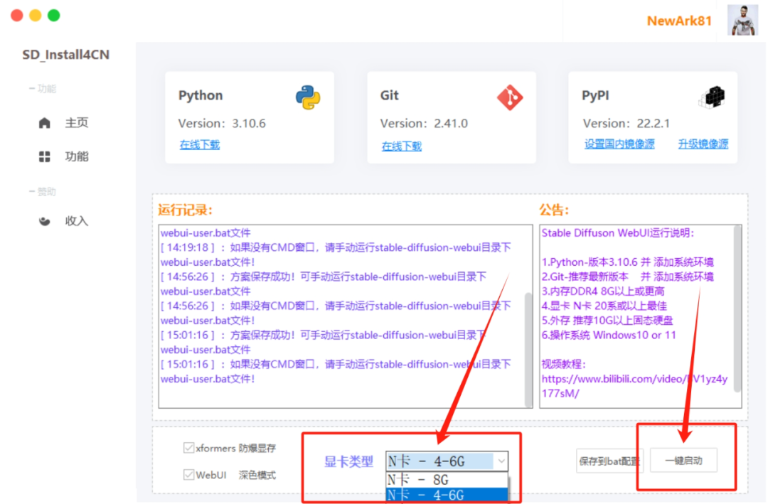 安装好模型之后,我们回到首页,选择显卡类型,根据自己的电脑选择,不要选择超过自身电脑的配置!!!