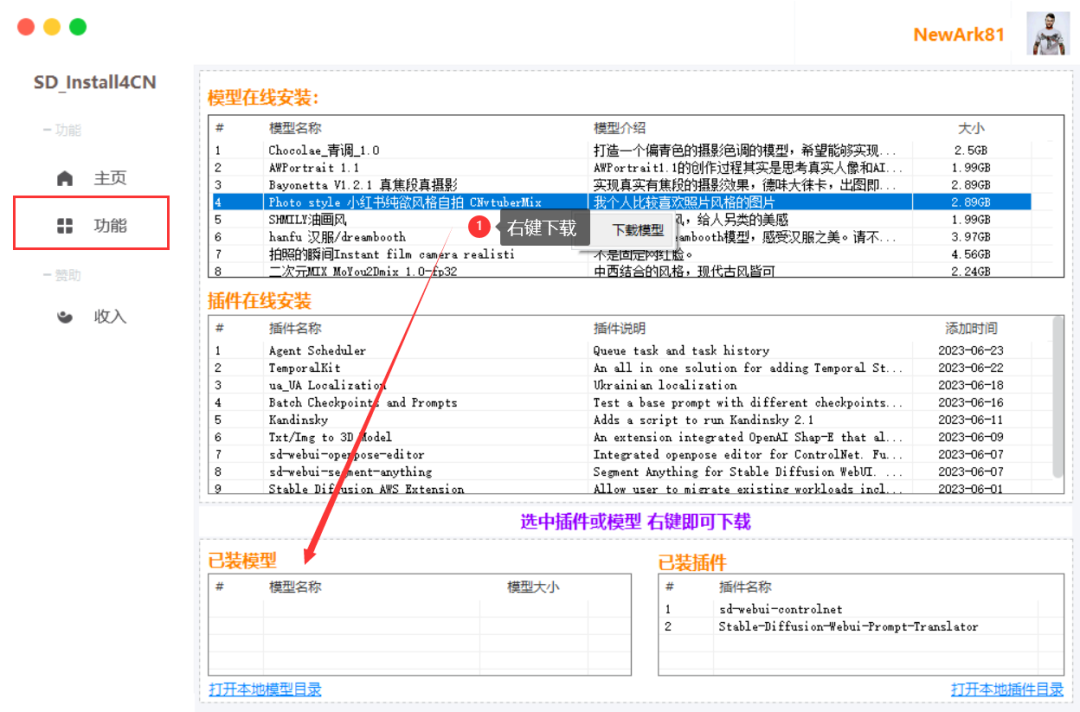 接下来我们来到功能页面,这里呢选择一些你需要的模型,右键下载即可,下载需要等待一会,完成之后就会出现在已安装模型里面。