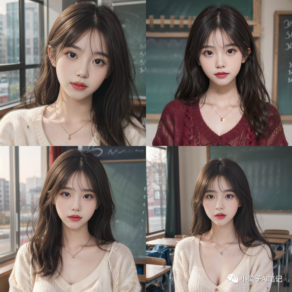 正向提示词:a beautiful girl, very delicate features, very detailed eyes and mouth, long hair, delicate skin, big eyes,red sweater, necklace,standing in the classroom, upper body photos,best quality, ultra-detailed, masterpiece, finely detail, highres, 8k wallpaper,lora:cuteGirlMix4\_v10:1
