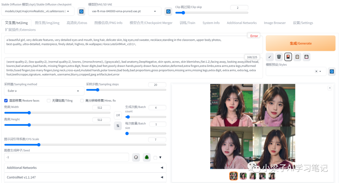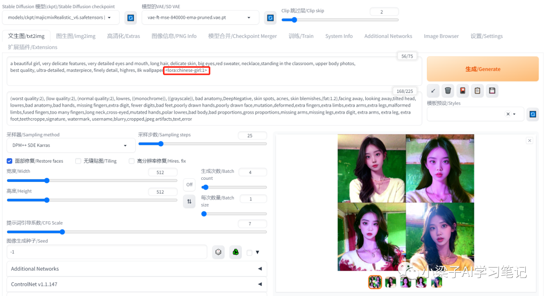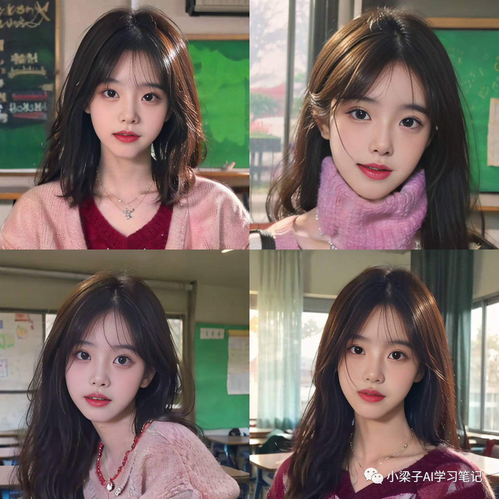 可见,将LORA模型cuteGirlMix4的权重设置为1,可以基本实现人脸的一致。