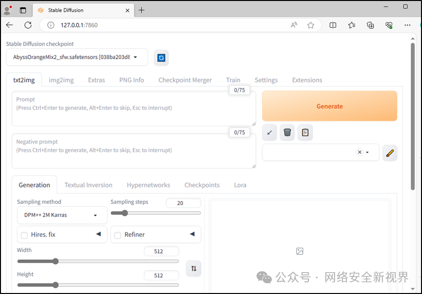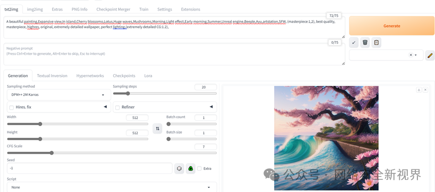 - 通过Stable Diffusion checkpoint选择要使用的模型文件(自己下载模型文件,也可以添加运营微信获取),通过txt2img选择“文生图”模式,输入关键词,点击页面中的Generate生成图片