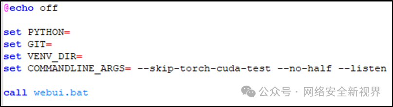 - 使用notepad++文本编辑器打开web-user.bat文件,根据需要进行相关参数的调整。在COMMANDLINE_ARGS=后添加–skip-torch-cuda-test --no-half