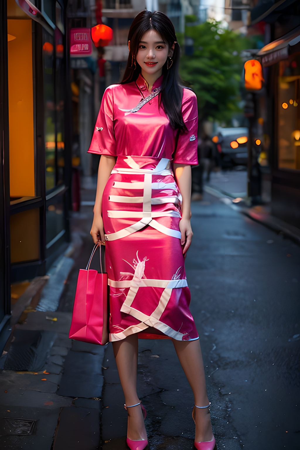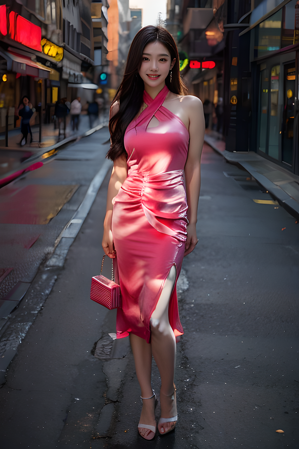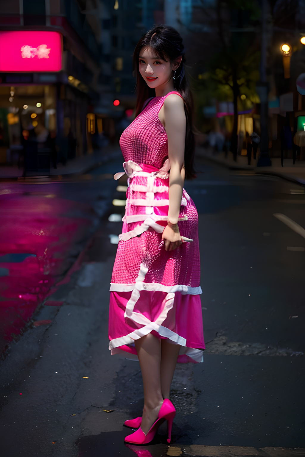 Prompt:1 super beautiful Chinese girl,smile,black hair,long hair,pink dress,standing in the street,(full body:1.2)