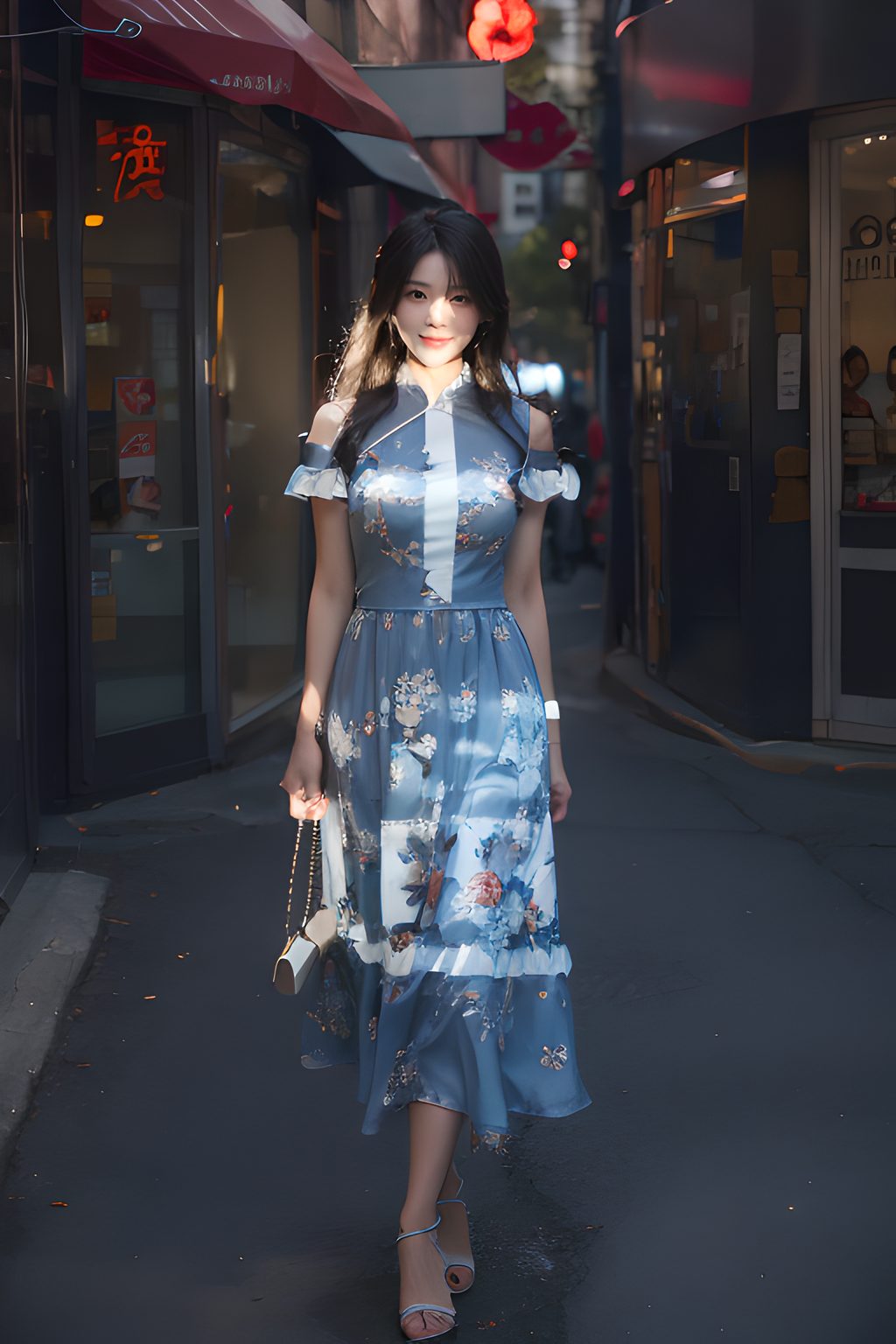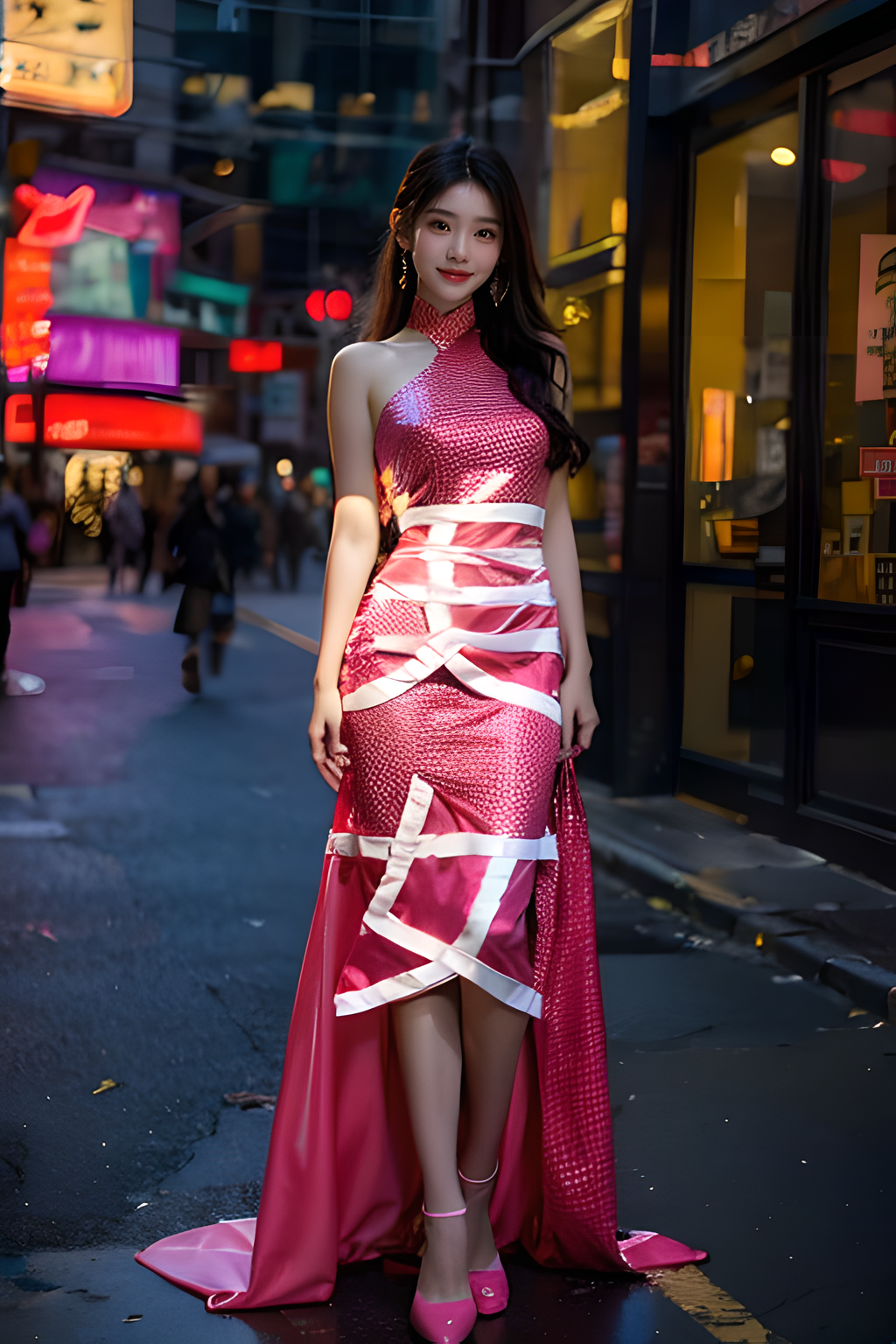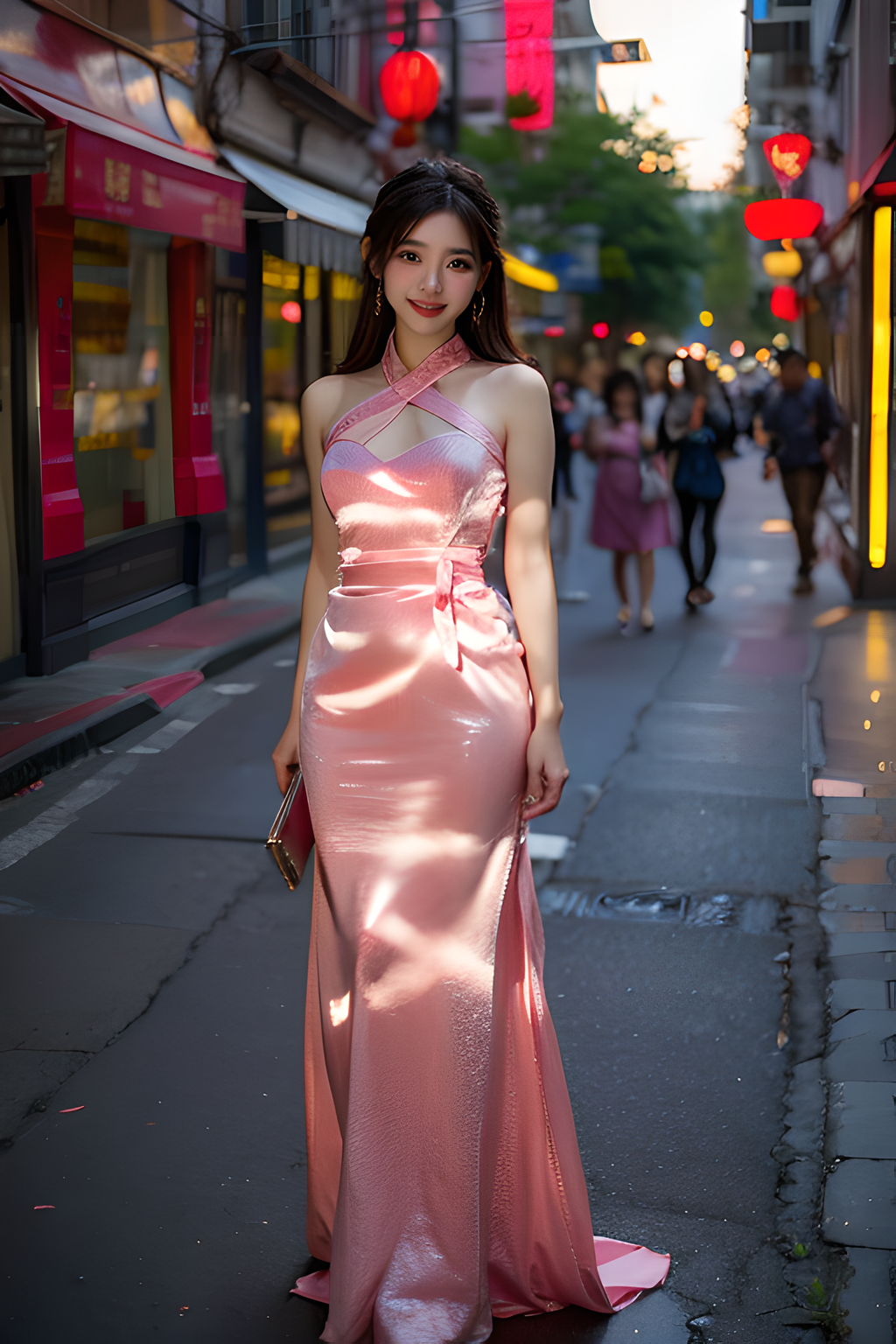 提示词:1个超级漂亮的中国女孩,微笑,黑发,长发,粉色连衣裙,站在街上,(全身:1.2)