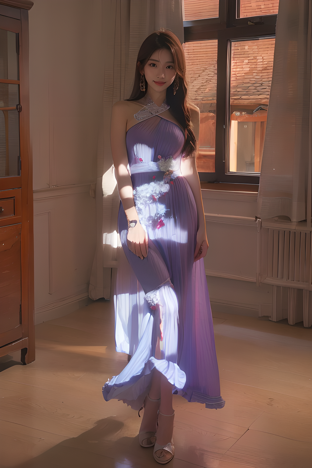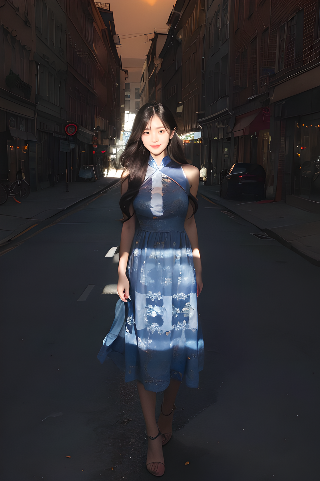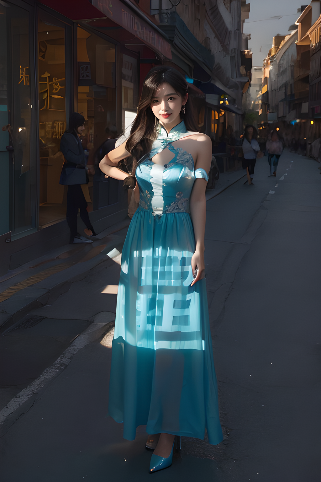 提示词:1个超级漂亮的中国女孩,微笑,黑发,长发,粉色连衣裙,站在街上,(全身:1.2)