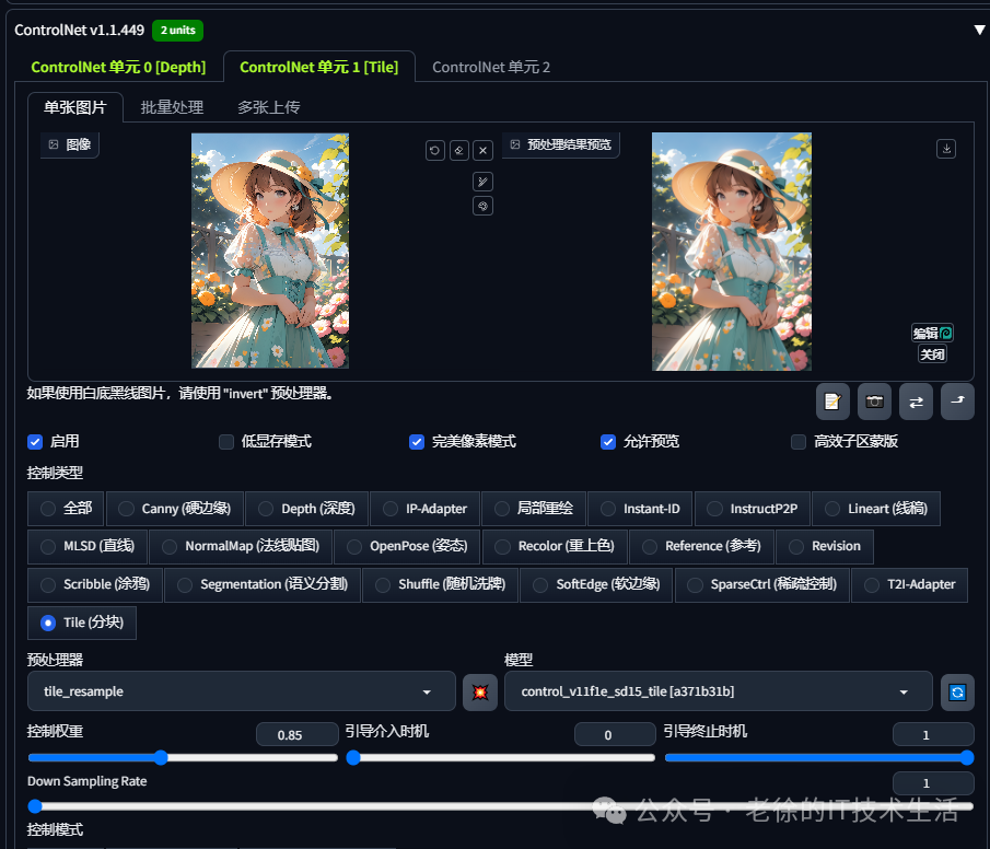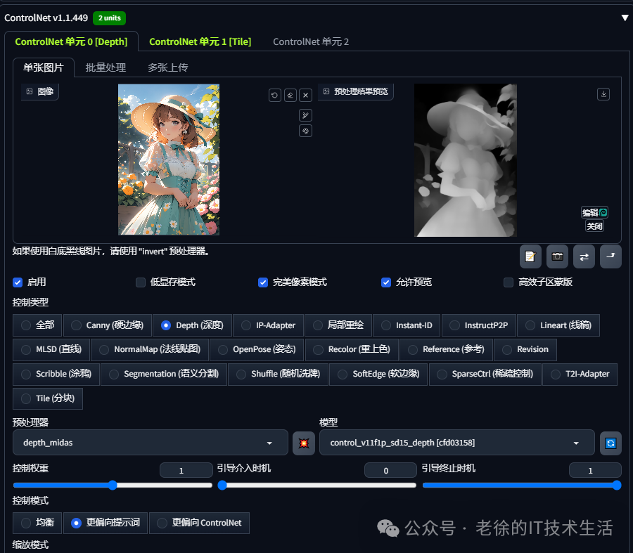 老徐这里开启了两个CN,分别选择了**Depth (深度)和Tile (分块),**控制权重不是固定值,这里建议根据不同结果来进行调整,选择适合的权重值。