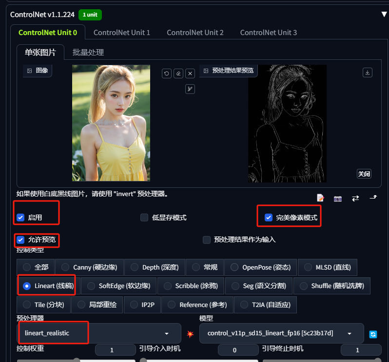选择线稿模式,因为我们是写实照片,所以模型选择写实线稿模型。