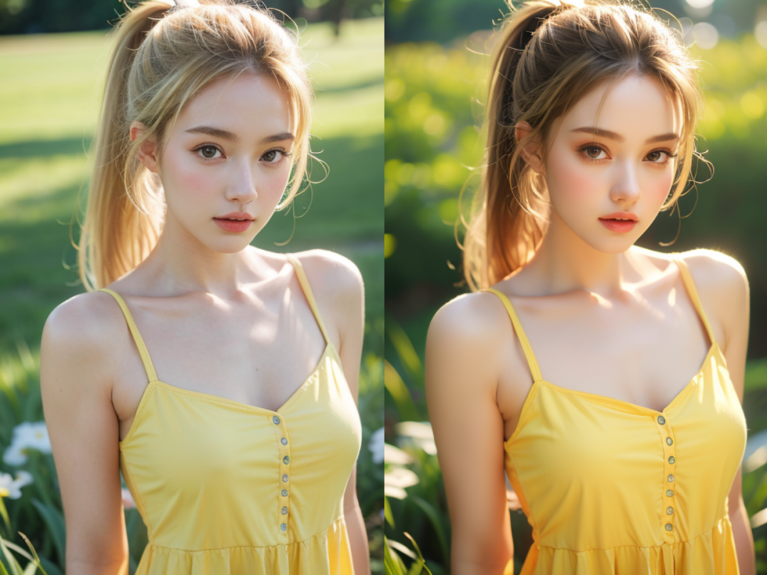 上面两幅图片的生成参数一样,尺寸也一样,但右边一幅图片相较于左面图片的画面质感,特别是人像皮肤的质感上有很大的提升,看上去更加细腻有层感。