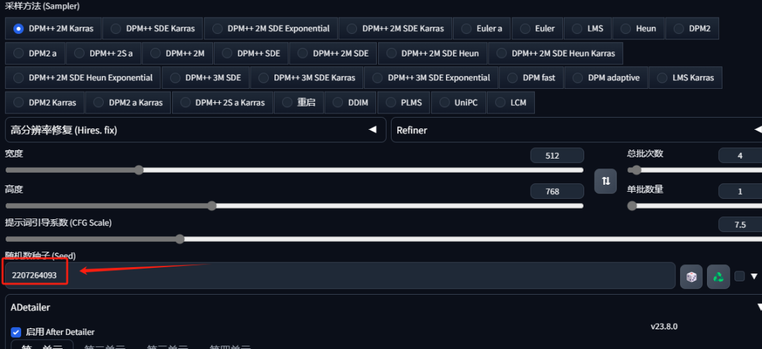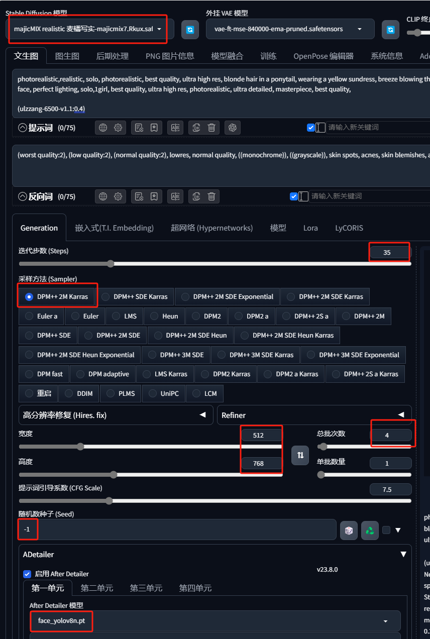 迭代步数设置在35左右,采样方法选择DPM++2M Karras,图片尺寸512*768,种子数随机。