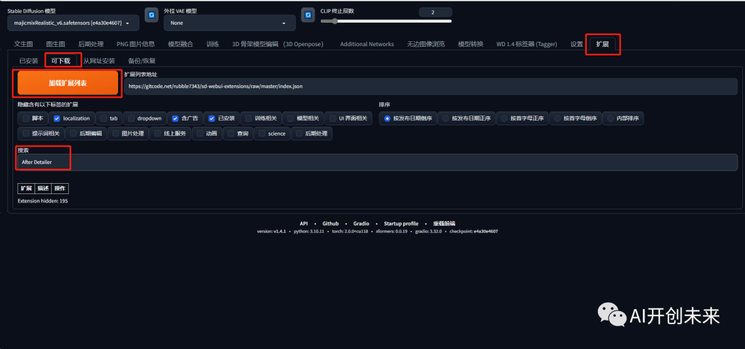 接下来就请出今天的主人公After Detailer,**首先我们需要安装这款插件,打开首页的扩展,点击可下载,然后点击加载扩展列表,在搜索框输入After Detailer,插件点击安装即可。**小集这里因为已经安装过了,所以搜索就没有显示。