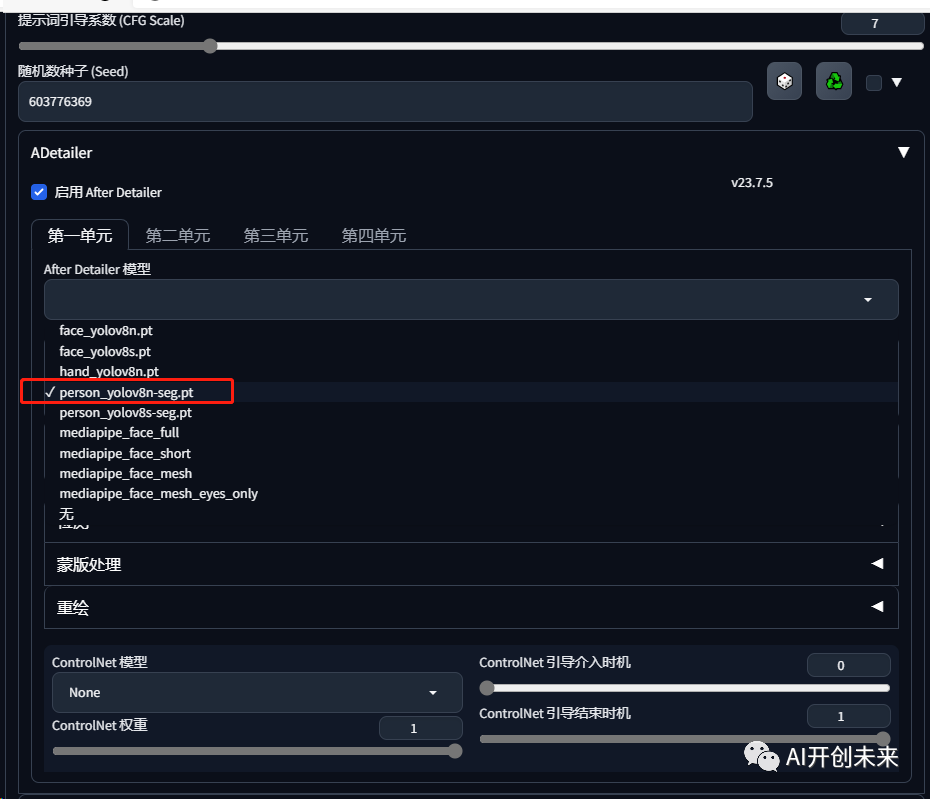 将图片作为种子,打开After Detailer,勾选启用,第一单元模型选择person volov8n-seg.pt,下方的文本框输入detail person。