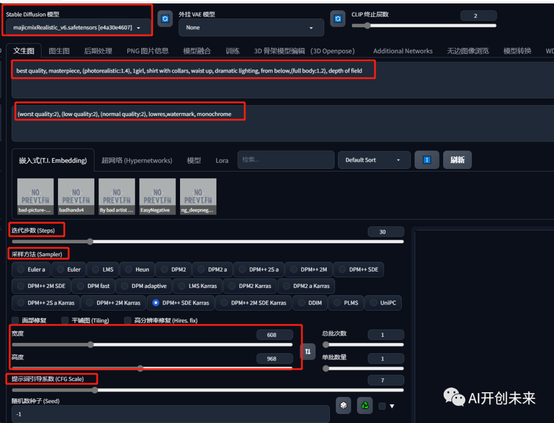 下面开始今天的教程演示。首先我们先选择一个大模型,然后给一些简单的提示词,然后调整一下基础参数,我们直接点击生成按钮,让Stable diffusion生成一张AI图片。