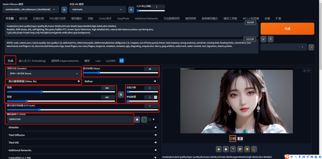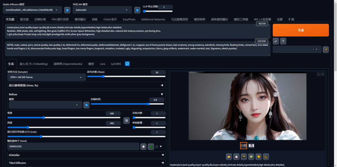 模型这里选择的是大模型xxmix9realistic_v40,没有使用lora模型,