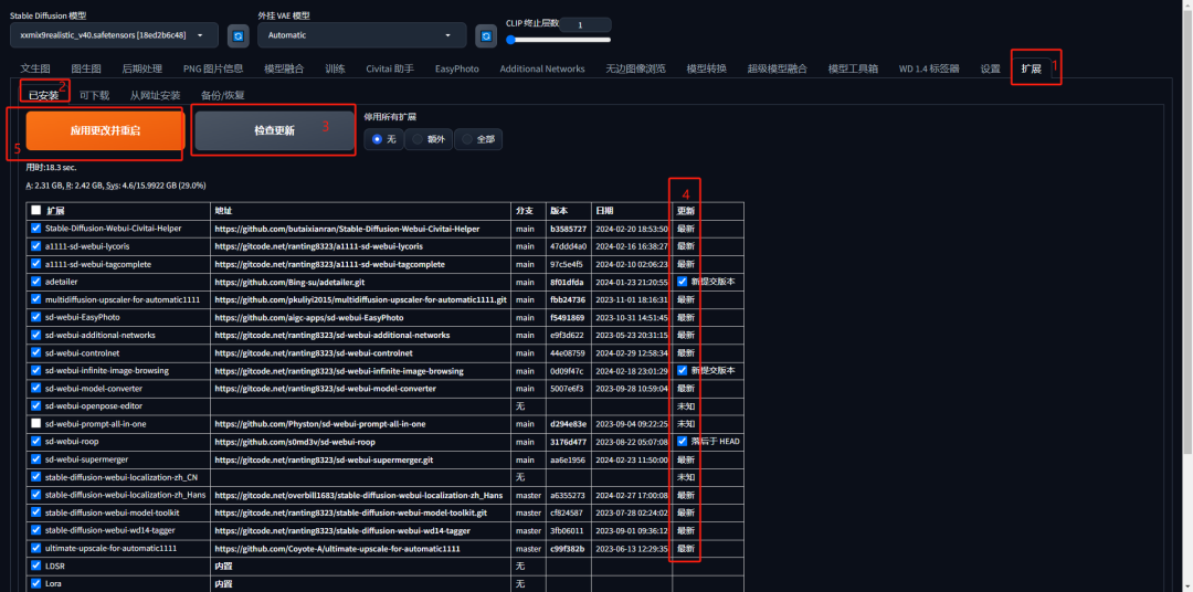 contronet等插件升级,依次点击SDwebui界面上的扩展,已安装,检查更新,出现升级检查进度条,然后勾选最新版本,如下图。