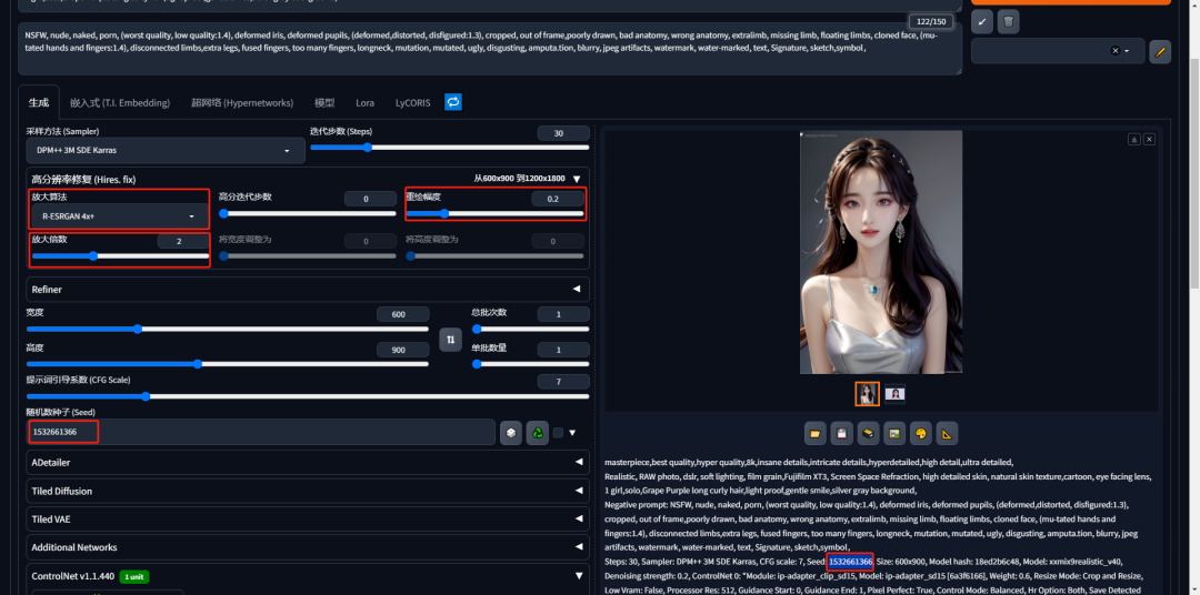 再打开高分辨率修复Hires.fix,放大算法选R-ESRGAN 4x+,重绘幅度调到0.2,放大倍数2倍,其他参数不变