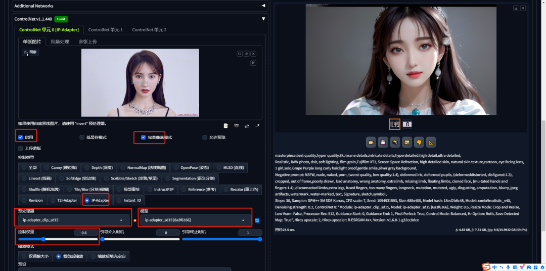 可以看到会自动勾选启用,同时你要手动勾选完美像素,点击控制类型IP-Adapter。