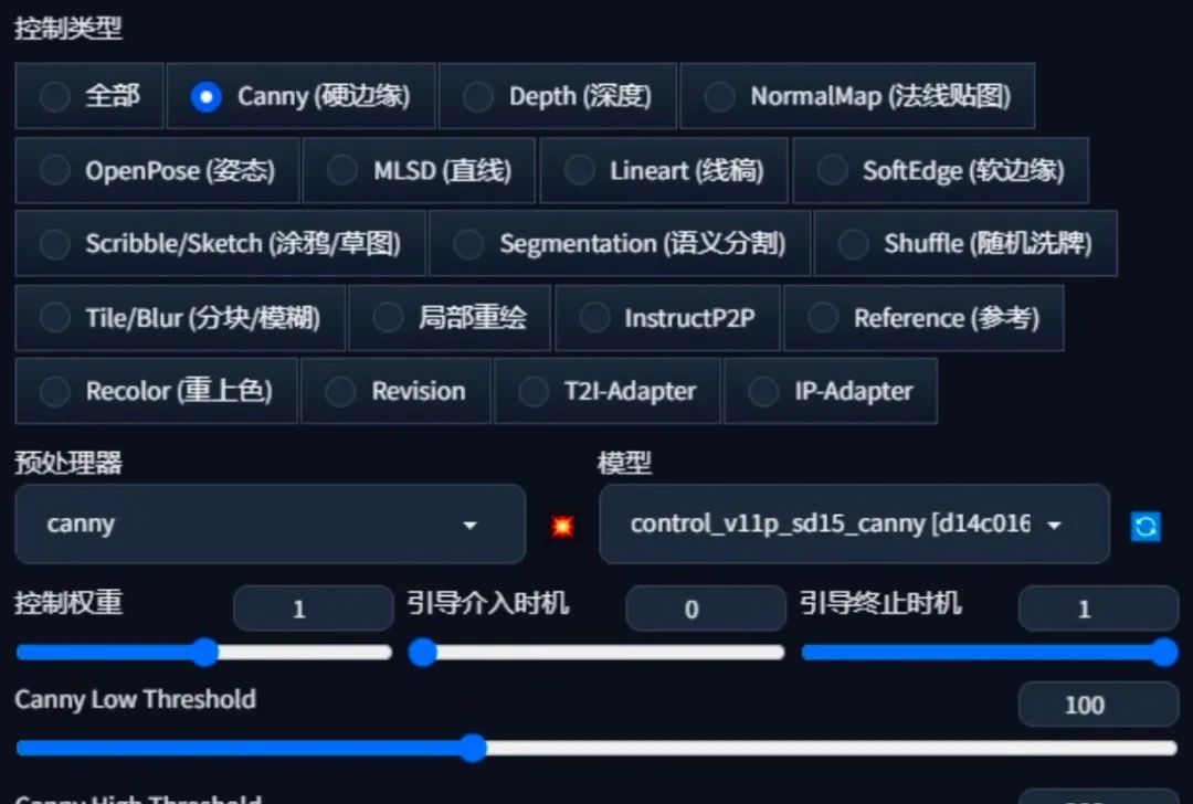 2. 控制类型选择“Canny”,然后预处理器以及模型会默认给我们选上,其他的参数保持默认即可。