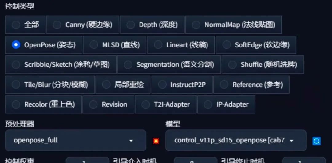 4. 控制类型选择“OpenPose”,预处理器选择“OpenPose_full”。